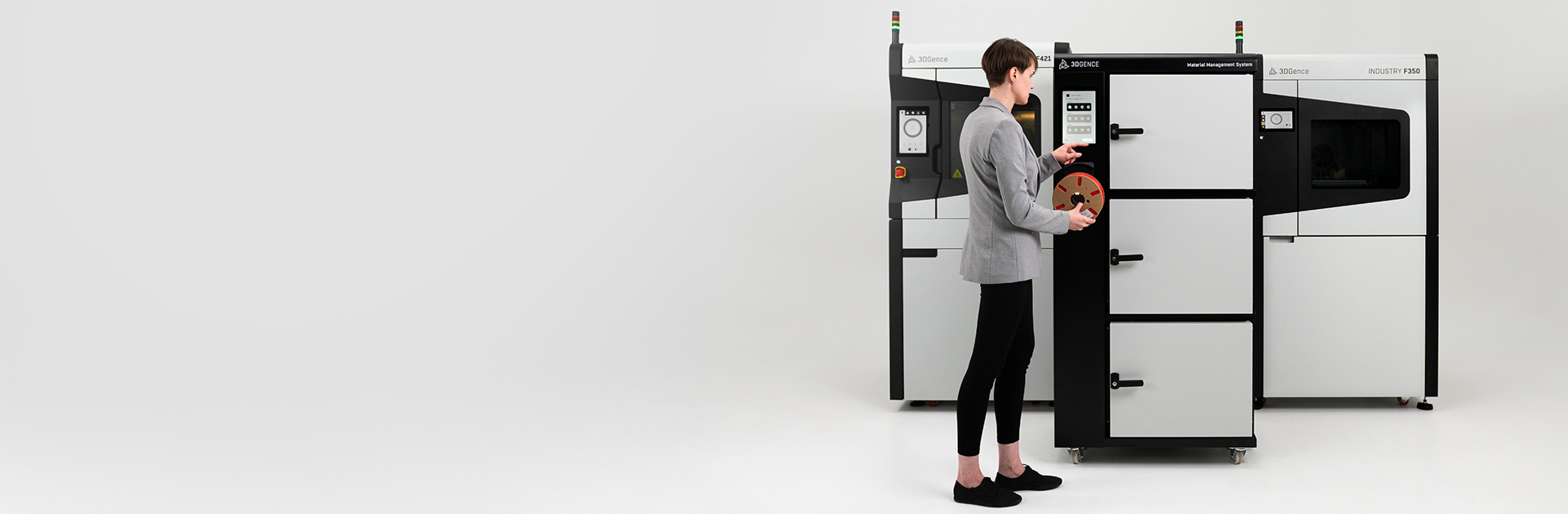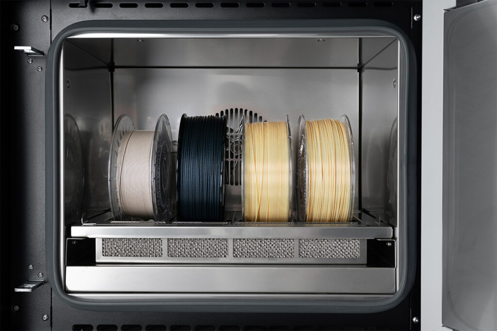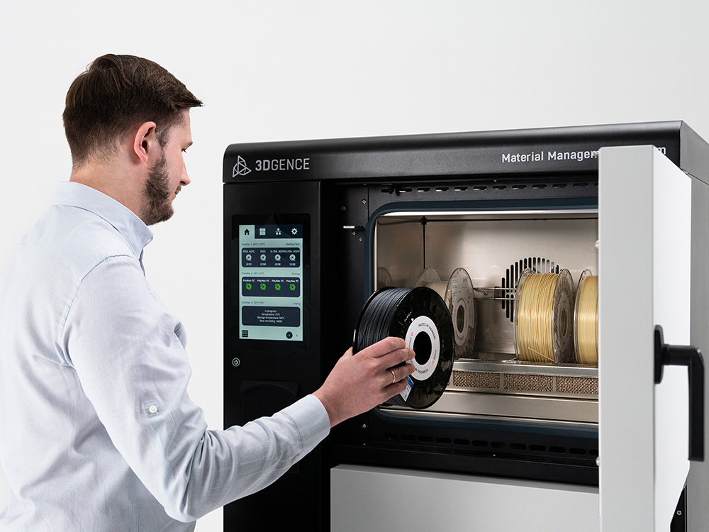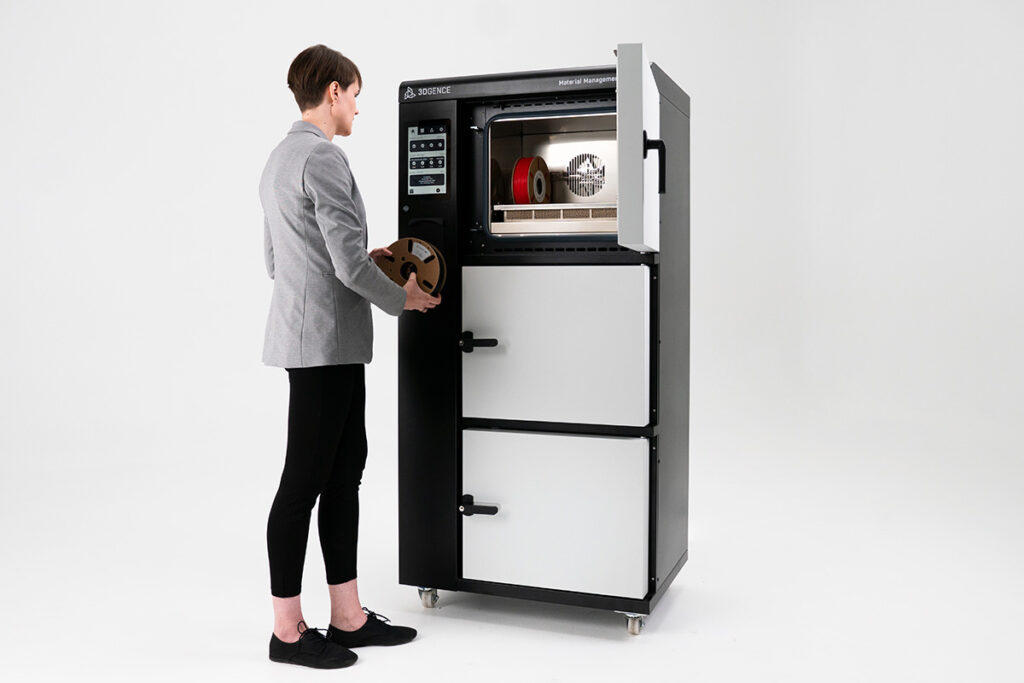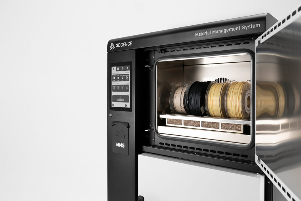Material Management System zapewnia właściwe przygotowanie filamentów. Wbudowana suszarka zapewnia najwyższą jakość wydruków 3d. Dzięki integracją z siecią 3DGence CLOUD można monitorować dostępne zasoby materiałów i planować produkcję.
