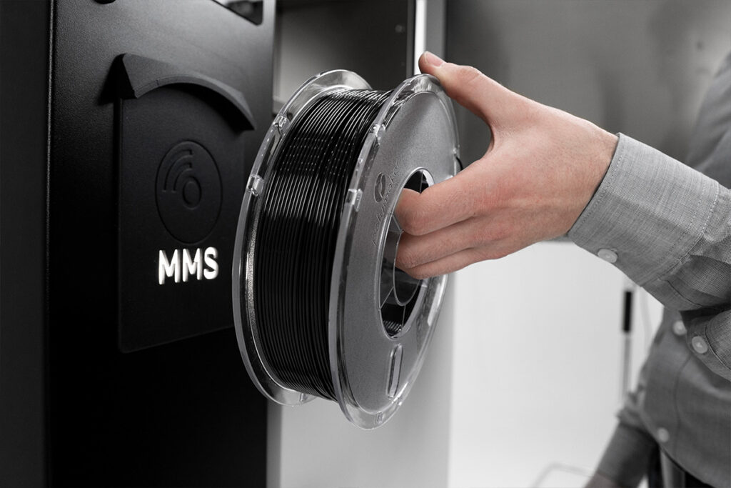 Wystarczy, że zarejestrujesz w MMS jeden z materiałów Certyfikowanej Bazy Materiałów, a system automatycznie sprawdzi parametry materiału. Wymagany do rejestracji identyfikator z tagiem NFC znajduje się na każdej szpuli materiałów 3DGence. Po wczytaniu danych do MMS system przesyła informacje do 3DGence CLOUD. Od tego momentu następuje śledzenie procesu produkcyjnego, który jest prowadzony na MMS lub na drukarce liniowej 3DGence INDUSTRY i dodatkowo jest rejestrowany w dziennikach procesu.
