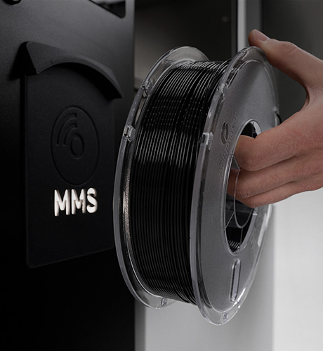 Wystarczy, że zarejestrujesz w MMS jeden z materiałów Certyfikowanej Bazy Materiałów, a system automatycznie sprawdzi parametry materiału. Wymagany do rejestracji identyfikator z tagiem NFC znajduje się na każdej szpuli materiałów 3DGence. Po wczytaniu danych do MMS system przesyła informacje do 3DGence CLOUD. Od tego momentu następuje śledzenie procesu produkcyjnego, który jest prowadzony na MMS lub na drukarce liniowej 3DGence INDUSTRY i dodatkowo jest rejestrowany w dziennikach procesu.