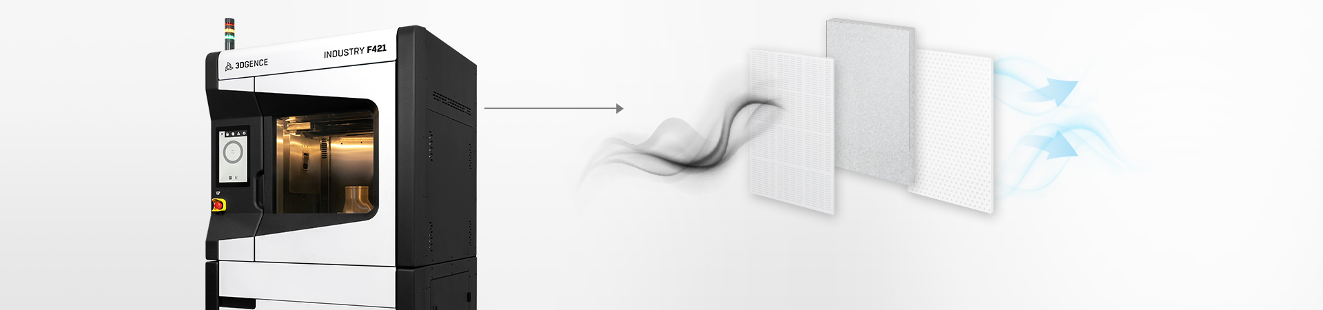 W 3DGence kompleksowo podchodzimy do wyzwań związanych z produkcją addytywną w technologii FFF. Działając w branży od niespełna dekady, doskonale rozumiemy ryzyko emisji oparów i zapachów podczas procesu drukowania z użyciem niektórych filamentów. Dołożyliśmy wszelkich starań, aby rozwiązać ten problem. Nasi klienci mogą wyposażyć swoją drukarkę w zaawansowany moduł filtrujący. Jest on kompatybilny z modelami INDUSTRY F421 i INDUSTRY F350. Obie maszyny posiadają zamkniętą komorę grzewczą, dzięki czemu opary nie wydostają się na zewnątrz. Opcjonalna, 3-elementowa jednostka filtrująca — składająca się z filtra Z-line G4, warstwy węgla aktywnego i filtra HEPA-H13 — jest w stanie oczyścić ultradrobne cząstki stałe (ang. ultrafine particles, UFPs), lotne związki organiczne (ang. volatile organic compounds, VOCs), opary rozpuszczalników i szkodliwe gazy. Jest to jedno z najlepszych rozwiązań dostępnych obecnie na rynku. Ta jednostka filtrująca jest w stanie usunąć mikroplastik i unoszący się w powietrzu styren. Co więcej, chroni również przed pyłami zawieszonymi PM10 i PM2,5.