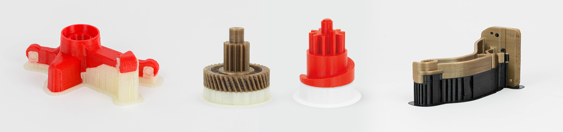 W zależności od stopnia złożoności geometrii modelu dobieramy wyłamywane lub rozpuszczalne struktury podporowe. Poniżej przedstawiamy przykłady modeli z różnymi materiałami podporowymi.