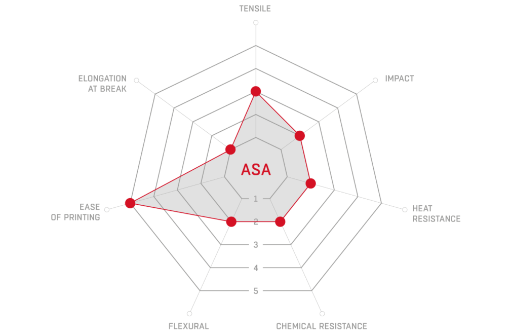 ASA has high level of dimensional stabilityand good chemical resistance.Since the chemical composition is close to ABS, the mechanical properties and printing characteristics are also very similar.