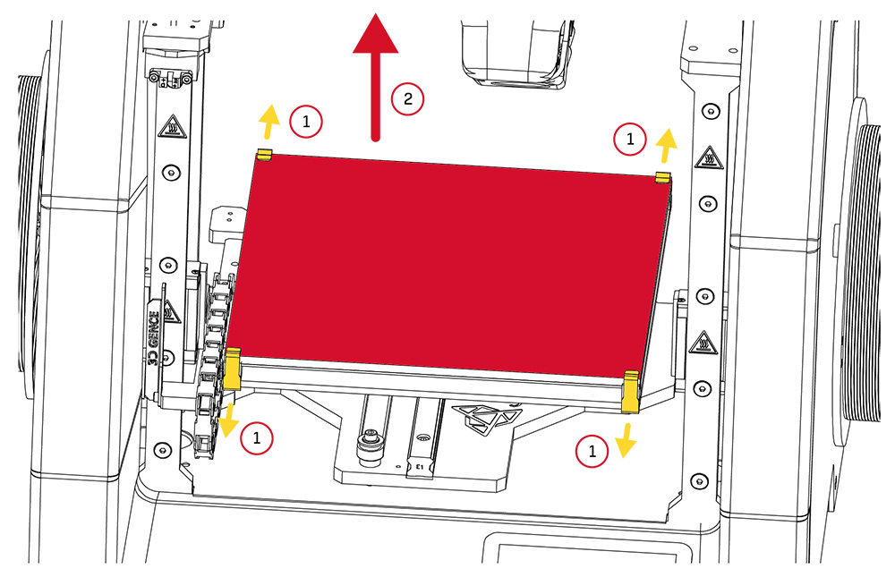 4. Remove the yellow shipping clips and the heatbed securing tapes. Make sure that nothing is left on the heatbed.