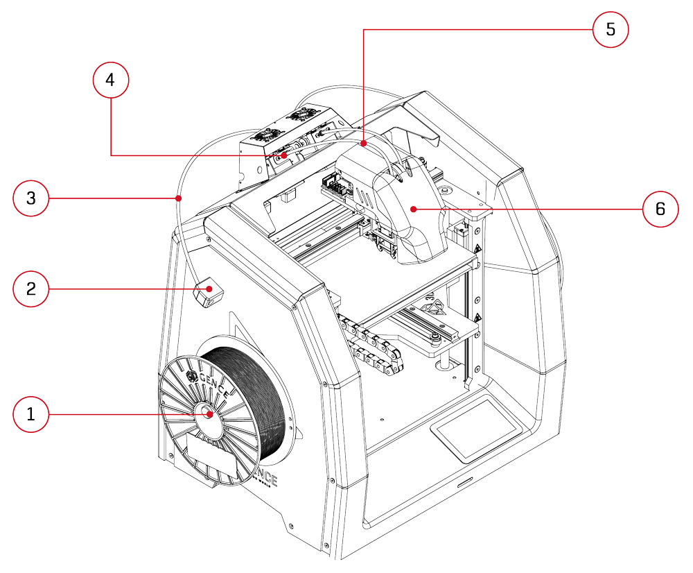 1. Check that the filament spool holder and guide system are correctly installed on the printer. The assembly of these elements is described in the “Quickstart” card attached to the printer.