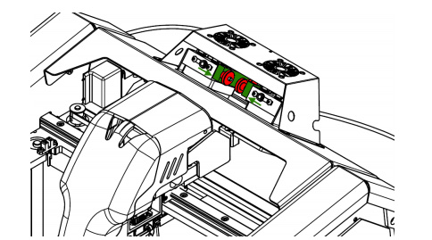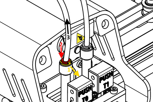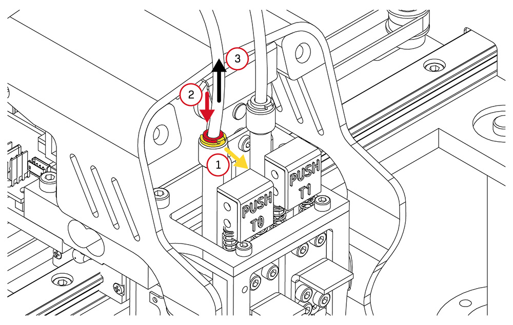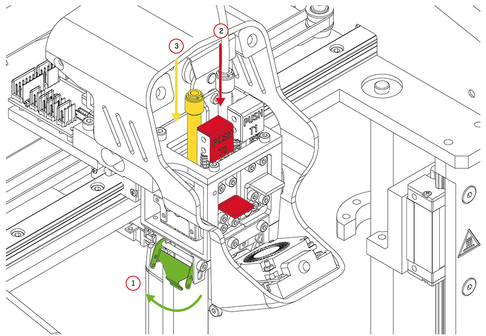 5. With one hand, gently bend the stopper to the left (in the case of T0 hotend) or to the right (in the case of T1 hotend) – in figure below, marked in green. At the same time, press fully and hold the PUSH key (red colour) and push the hotend up while holding it from the bottom with your hand (yellow colour). Make sure that the hotend does not fall on the ceramic heatbed under its own weight.