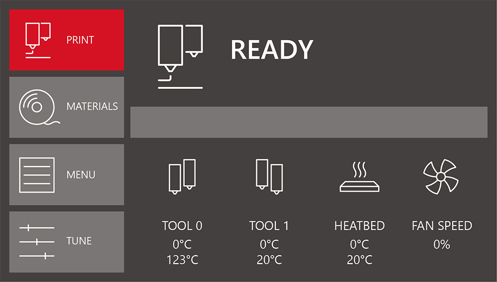 1. If the material is in the hotend, heat the hotend up to the plasticization temperature of the given material and wait for the hotend to reach the preset temperature: TUNE → Tool 0/Tool 1 and using +/- key set the temperature.
