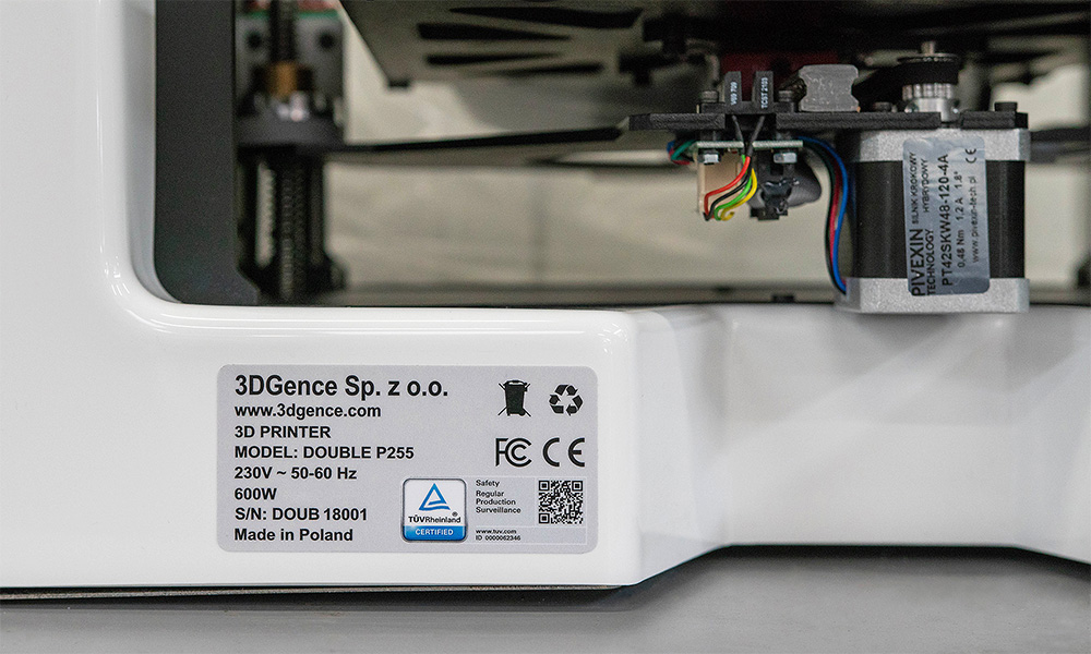 3DGence DOUBLE P255 printer is equipped with LED backlight located under the printer’s upper plate. The LED backlight illuminates the printout during the printer operation and is also a form of signalling device.