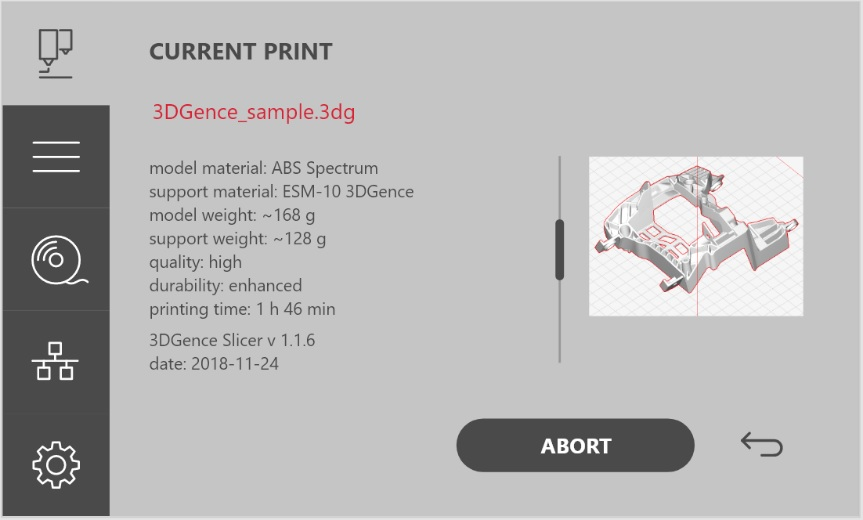 When you select the multifunction button basic information about the printed model is displayed and the printing process can be interrupted (Fig. 1). Before the “abort” button is selected a confirmation, message is displayed.