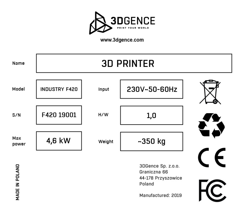 The serial number starts with a symbol: S/N F420, which should be provided when contacting the 3DGence Technical Support.