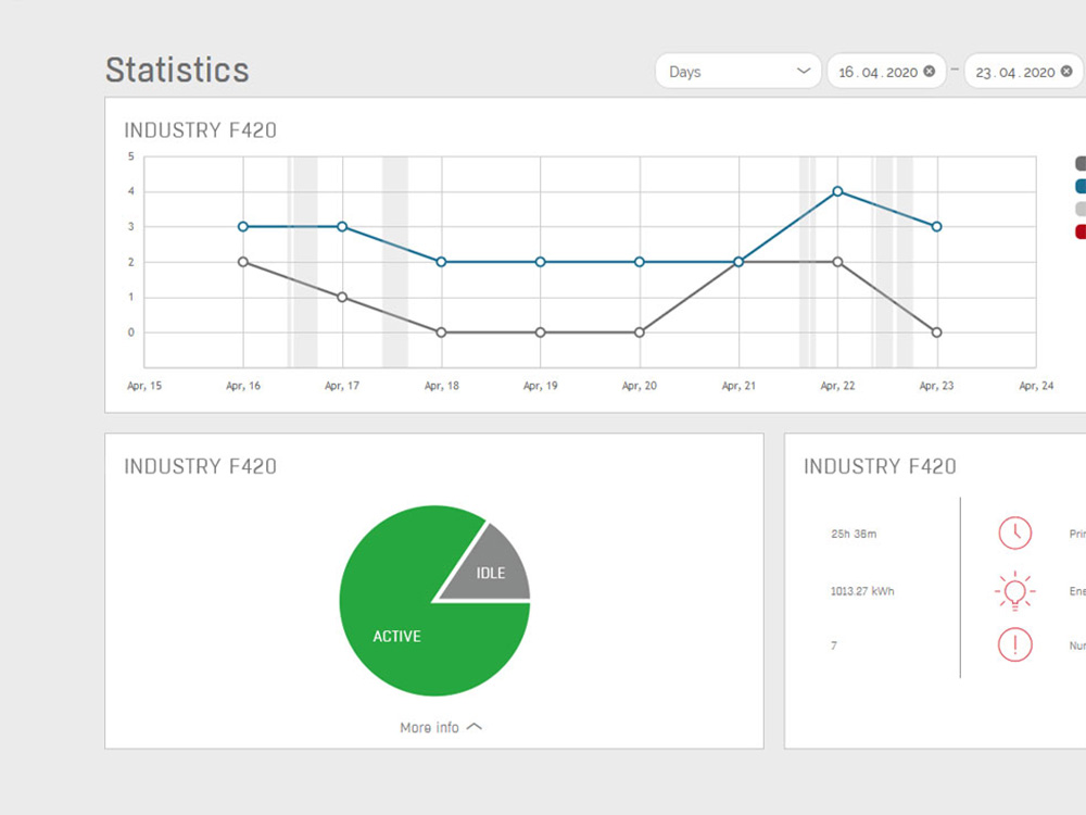 Oprogramowanie jest w stanie agregować i prezentować statystyki wykorzystania maszyn i materiałów. Wszystkie dane użytkownika przesyłane przez CLOUD są bezpieczne dzięki asymetrycznemu szyfrowaniu.