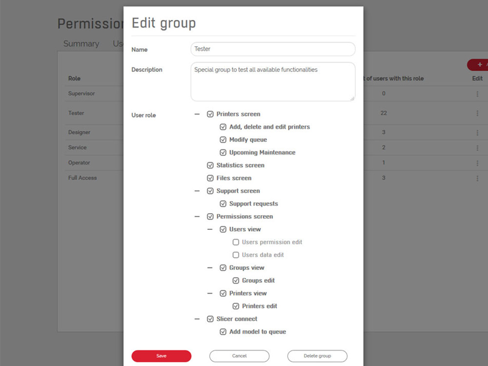 Dostęp do poszczególnych opcji chmury może być ograniczony do predefiniowanych grup użytkowników. Administrator może rozróżnić grupy użytkowników w celu zapewnienia bezpieczeństwa procesu i wszystkich zadań.